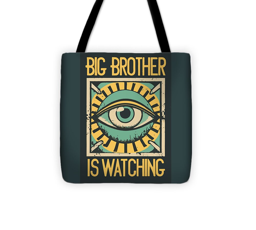 Purchase a tote bag featuring the digital art "Big Brother is Watching" by Scar Design.   Our tote bags are made from soft, durable, poly-poplin fabric and include a 1" black strap for easy carrying on your shoulder.   All seams are double-stitched for added durability.   Each tote bag is machine-washable in cold water and is printed on both sides using the same image.