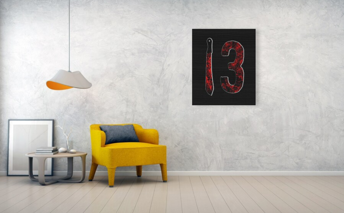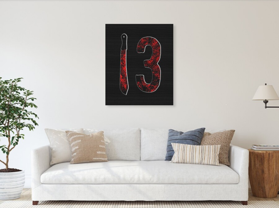 Gruesome meets iconic in this horror-themed wood print! Featuring a bloodied machete and the cursed number 13—perfect for slasher film fans & collectors.