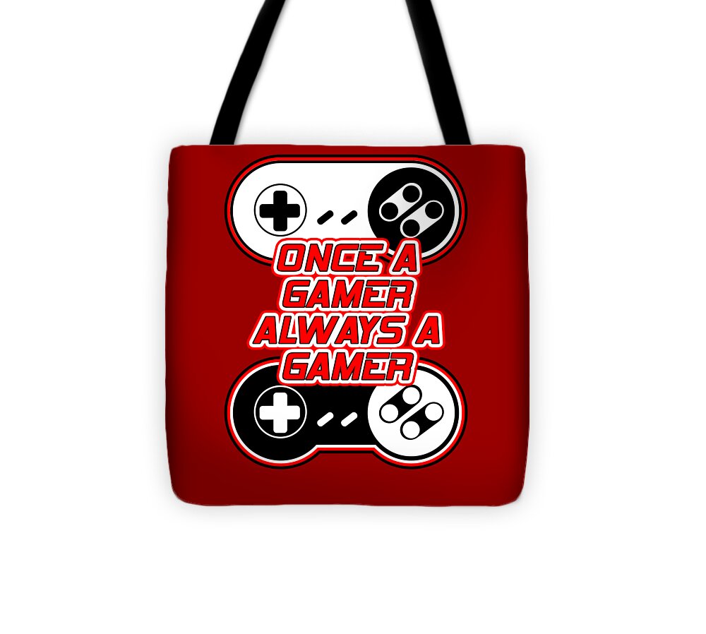 Purchase a tote bag featuring the digital art "Once a Gamer, Always a Gamer" by Scar Design. Our tote bags are made from soft, durable, poly-poplin fabric and include a 1" black strap for easy carrying on your shoulder. All seams are double-stitched for added durability. Each tote bag is machine-washable in cold water and is printed on both sides using the same image.