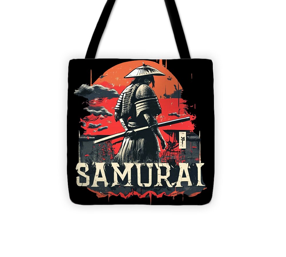 Purchase a tote bag featuring the digital art "Samurai Warrior Vintage Sunset" by Scar Design. Our tote bags are made from soft, durable, poly-poplin fabric and include a 1" black strap for easy carrying on your shoulder. All seams are double-stitched for added durability. Each tote bag is machine-washable in cold water and is printed on both sides using the same image.
